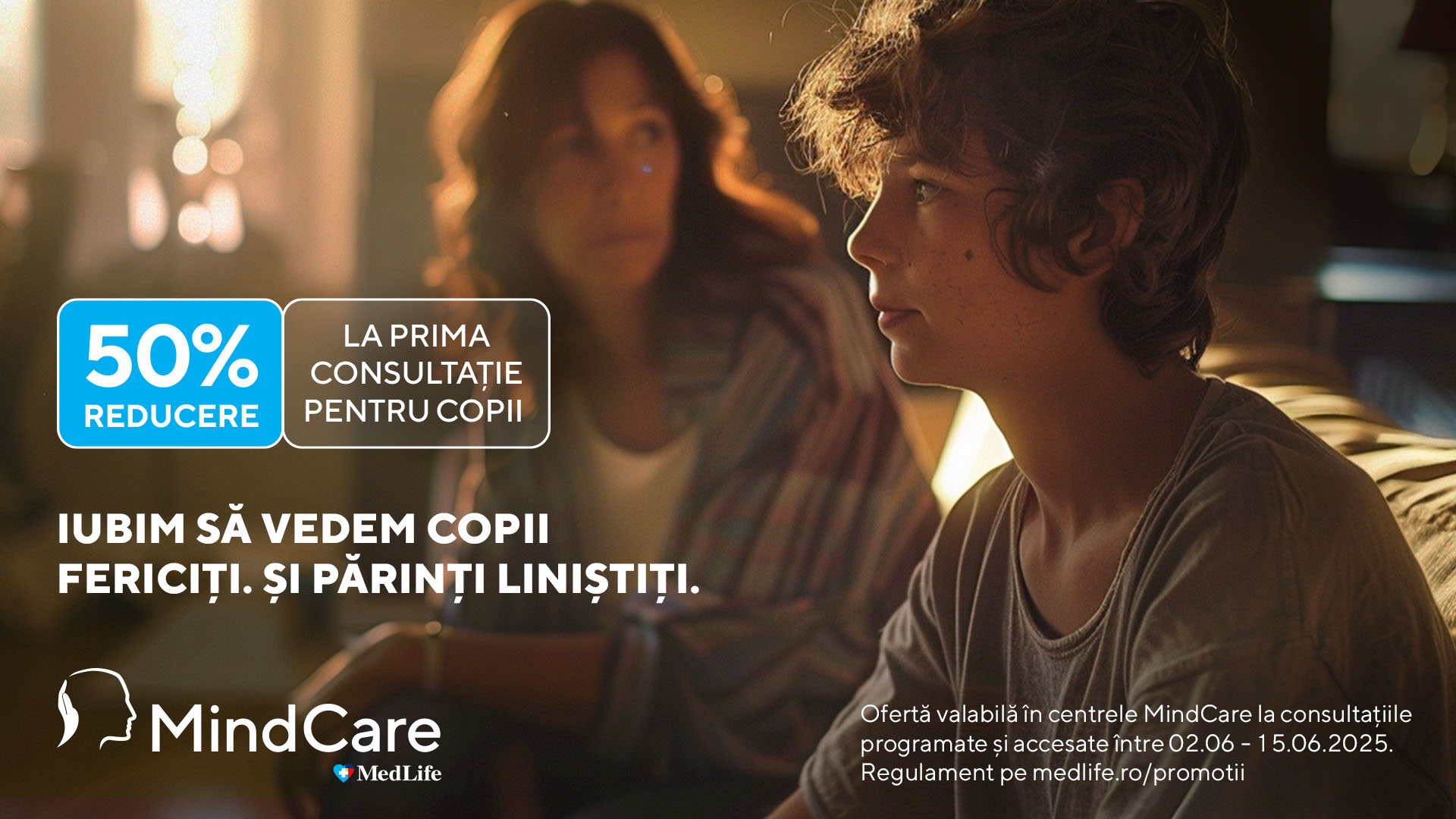 Anxietatea și depresia sunt din ce în ce mai prezente în viața copiilor. 10% dintre cei între 3–17 ani au anxietate; 7% au tulburări de comportament, arată datele CDC. Netratate, acestea se pot transforma în probleme serioase de sănătate mintală. Suicidul reprezintă a treia cauza principală de deces la adolescenți (15–19 ani). Pentru a veni în sprijinul părinților, între 2 – 15 iunie 2025, MedLife oferă 50% reducere la prima consultație psihologică sau psihiatrică pentru copiii lor (cu vârsta sub 18 ani) în centrele de psihiatrie și psihoterapie MindCare din București, Craiova, Constanța. Oferta este destinată pacienților noi, iar reducerea se aplică direct în recepție, în momentul plății.