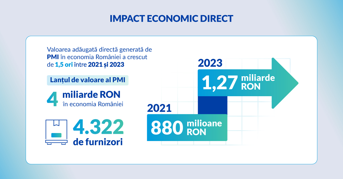- În 2023, valoarea adăugată directă în economia României a ajuns la 1,27 miliarde RON, în creștere de la aproape 880 de milioane RON