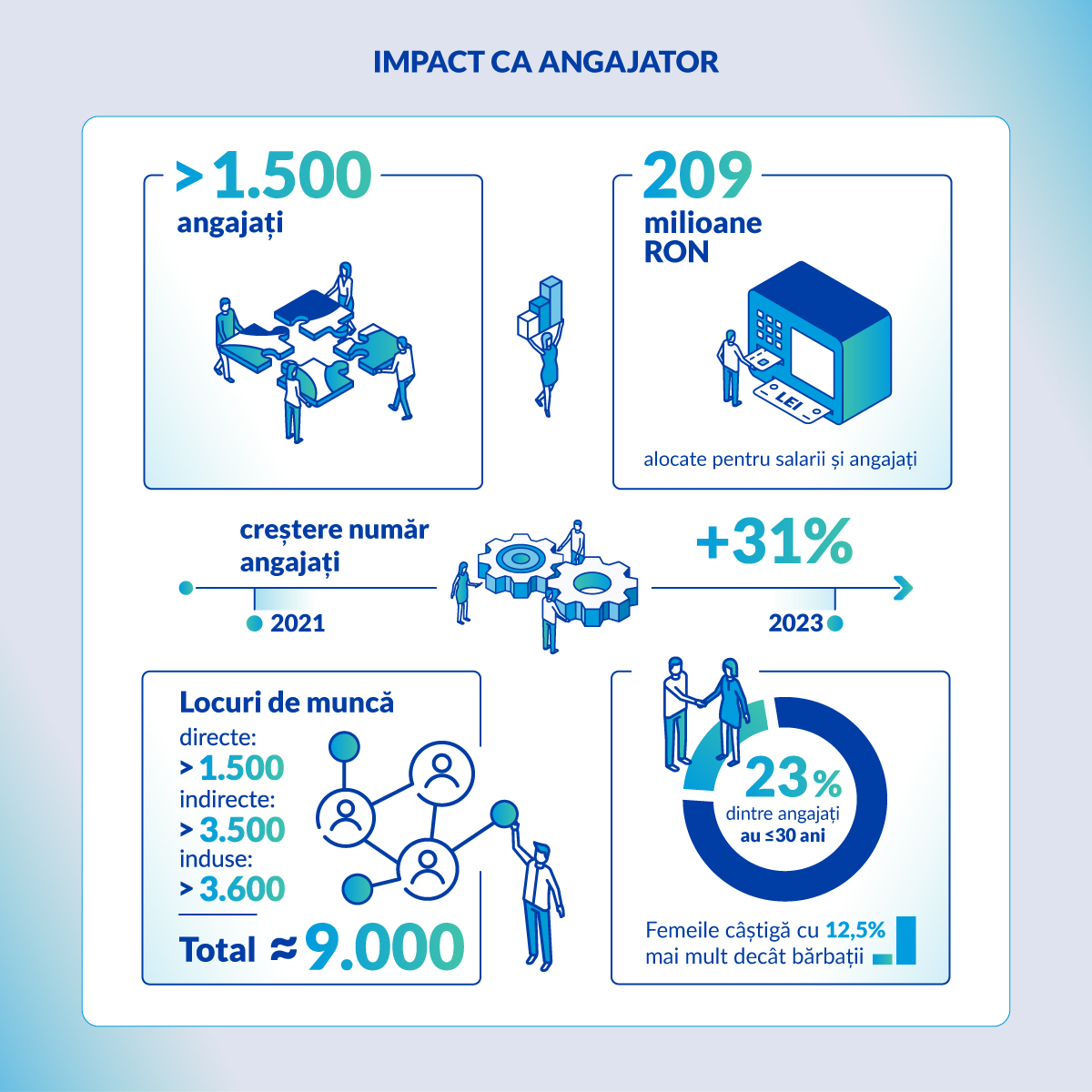 - Peste 1.500 de angajați direcți și circa 9.000 de locuri de muncă prin efecte directe, indirecte și induse
