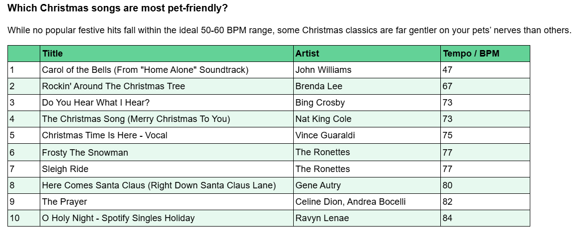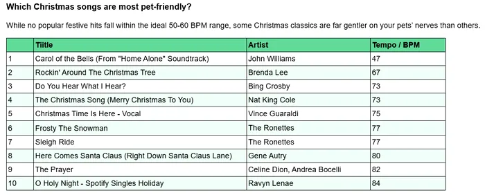 Cu toate că niciun hit major de Crăciun nu se încadrează în intervalul ideal de 50–60 BPM, experții au identificat totuși melodii mult mai blânde pentru animalele de companie. În fruntea listei se află „Carol of the Bells” în interpretarea lui John Williams, cu doar 47 BPM — singura piesă din playlist care se apropie cu adevărat de ritmul calm recomandat pentru câini.