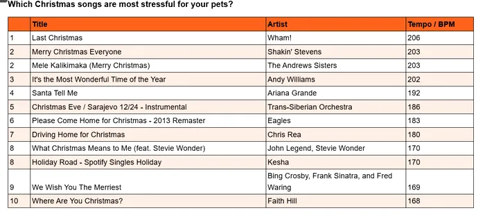 Cea mai stresantă melodie identificată este „Last Christmas” de la Wham!, cu nu mai puțin de 206 BPM. Urmează „Merry Christmas Everyone” de Shakin’ Stevens și „Mele Kalikimaka” de The Andrews Sisters, ambele cu 203 BPM. Ritmul lor accelerat și instrumentația intensă pot suprasolicita sistemul auditiv al animalelor, care percep sunetul mult diferit față de oameni.