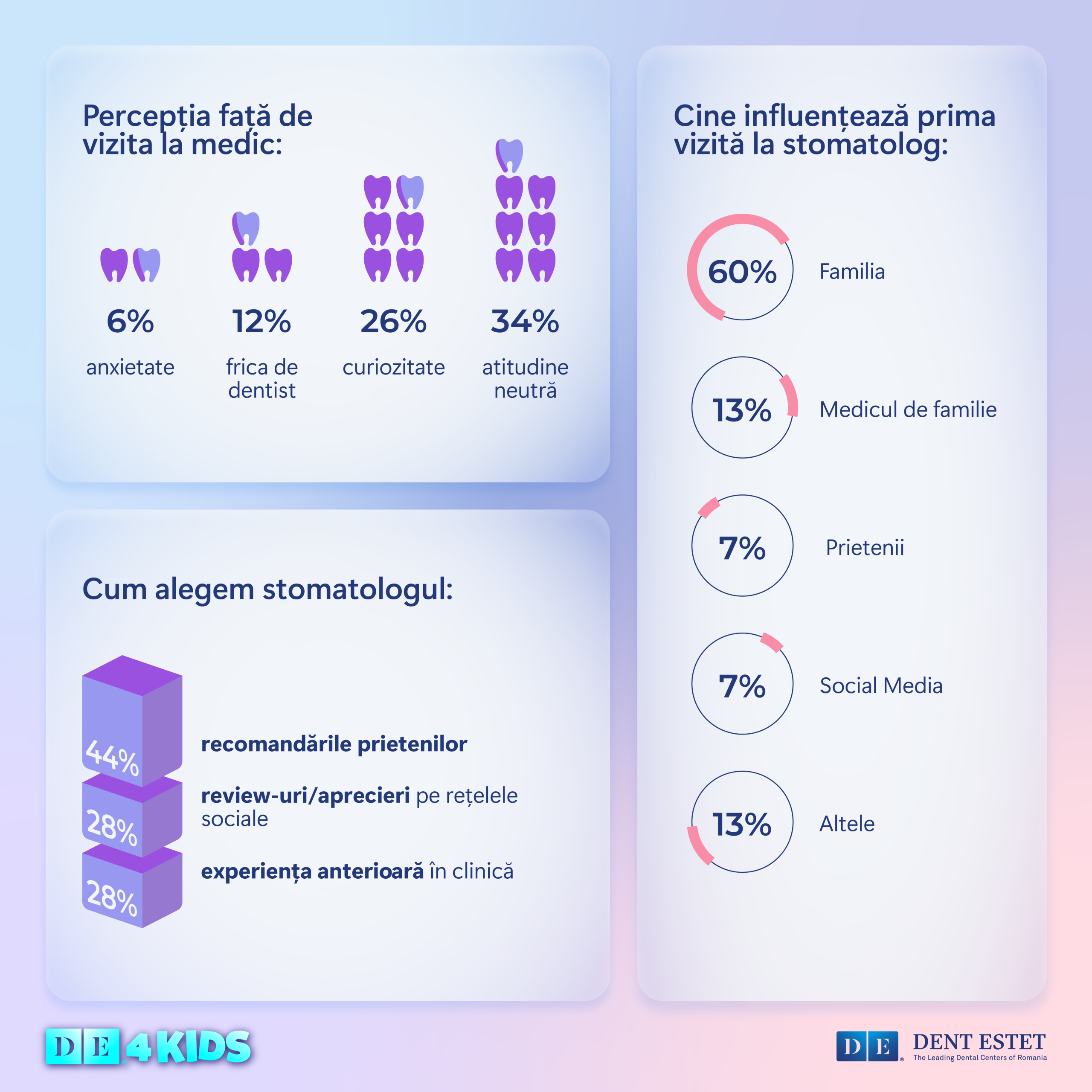 Potrivit cercetării efectuate în baza unor chestionare completate de părinți cu privire la sănătatea dentară a copiilor, doar 12% dintre pacienții minori mai simt frică atunci când merg la dentist, iar doar 6% resimt anxietate. În schimb, aproape 1 din 3 copii manifestă curiozitate (26%), iar 34% au o atitudine neutră – semn al unei relații tot mai relaxate cu vizitele la stomatolog.