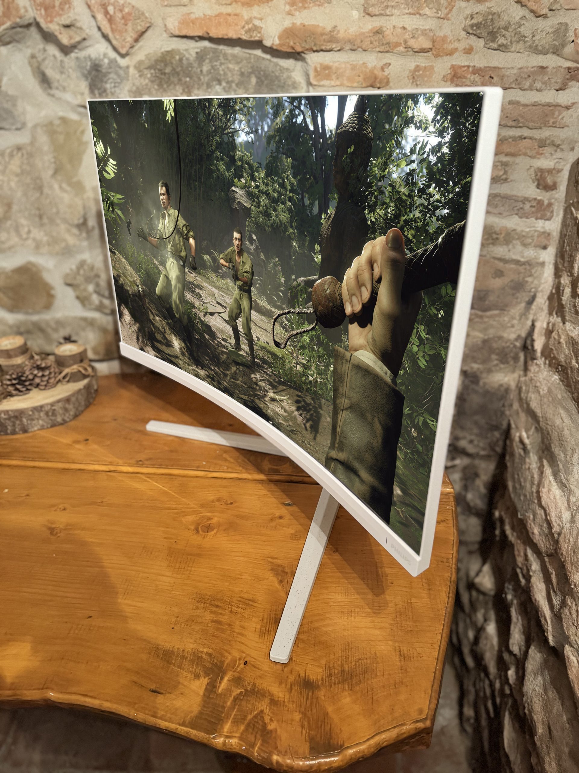 Am continuat cu Indiana Jones and the Great Circle, unde cinematica și atmosfera sunt parte din plăcerea jocului. Aici Ambiglow își justifică reputația, iar beneficiul e evident. Reflexele torțelor, sclipirile metalice ale artefactelor și tranzițiile dintre camere luminate cald și coridoare întunecate s-au prelungit pe peretele din spate într-un halou coerent cu imaginea, crescând parcă organic senzația de „ecran” mai mare decât este. HDR-ul a adăugat o treaptă de dinamică în highlight-uri, fără să forțeze expunerea, iar schimbarea rapidă între secvențe nu a indus nici tearing, nici drop-uri vizibile, sincronizarea adaptivă ținând lucrurile perfect lipite de GPU.