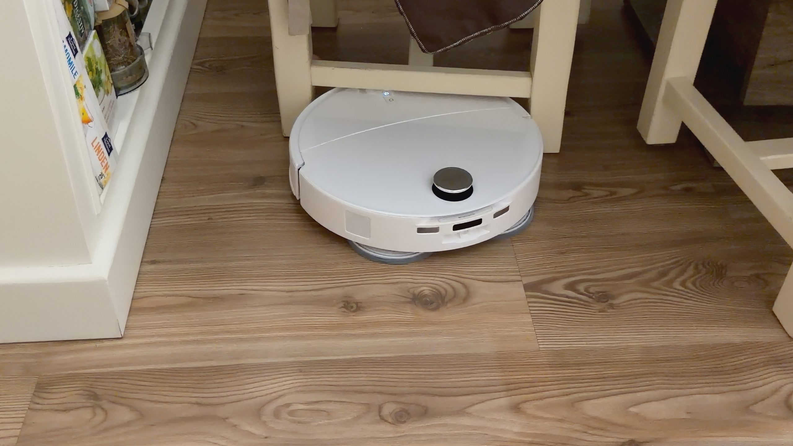FlexiArm Technology nu se rezumă la perie, ci include și modul în care robotul lucrează pe lângă plinte și în colțuri. Atunci când ajunge aproape de pereți, Qrevo EdgeT își extinde în mod automat peria laterală și mopul din dreapta, astfel încât distanța până la margine să fie practic zero. Rezultatul este o acoperire mult mai bună în zonele unde, de obicei, rămân mici dâre de praf, iar în jurul picioarelor de masă și al dulapurilor se vede clar că frontul de curățare ajunge mai aproape decât în cazul unui robot cu perie fixă.