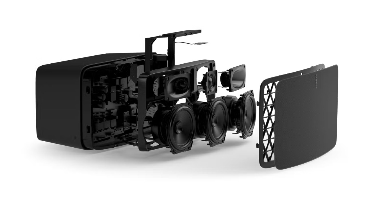 Arhitectura acustică a lui Sonos Five este gândită pentru fidelitate reală, nu pentru artificii. În interior lucrează șase amplificatoare digitale de clasă D, perfect potrivite cu incinta etanșă, care elimină reverberațiile și ecourile nedorite. Trei tweetere livrează un răspuns înalt curat, cu unul central dedicat articulării vocilor și două tweetere în unghi pentru extensie spațială, în timp ce cele trei midwoofere se ocupă de registrul mediu și de un bas ferm, controlat, fără distorsiuni. Rezultatul este un sunet care umple fără efort încăperi mari, cu separație stereo clară și microdetalii pe care puține boxe „all-in-one” le surprind.