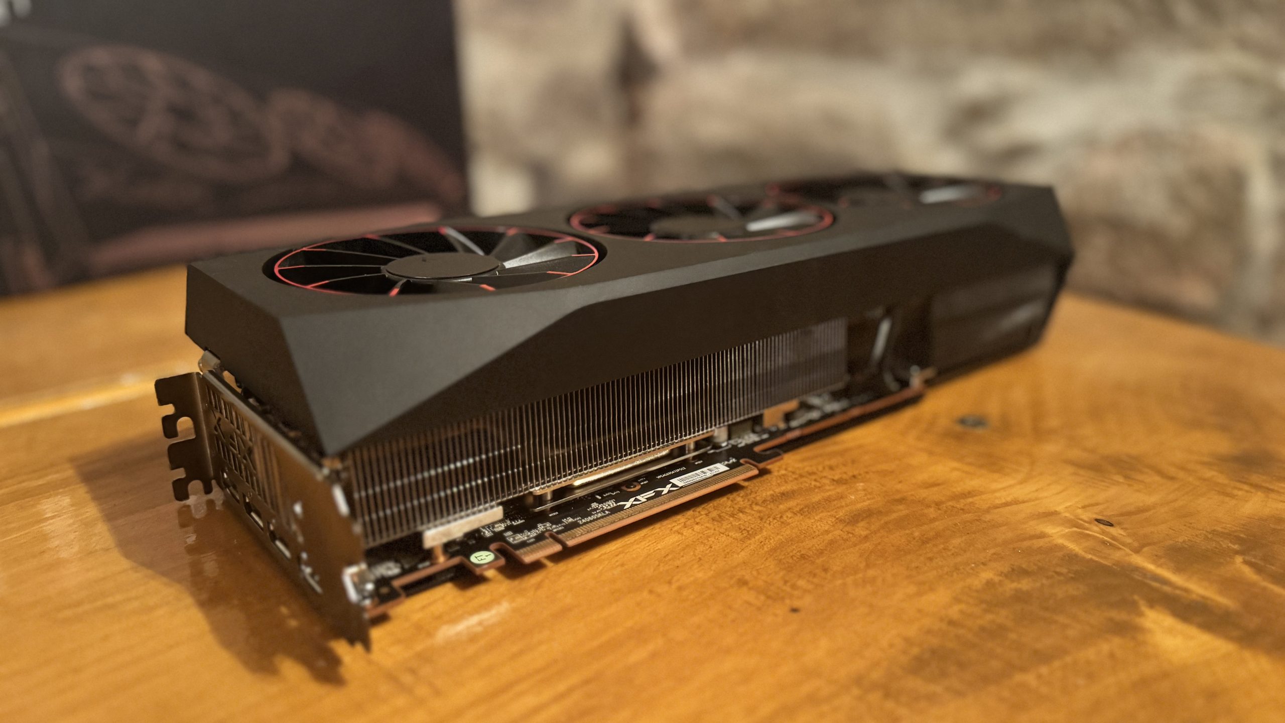 La nivel vizual, placa este impunătoare: aproximativ 36 × 15,5 × 7,2 cm, cu un profil de 3,5 sloturi, motiv pentru care XFX include în pachet un suport anti-sag dedicat. Alimentarea se face prin trei conectori PCI-E 8-pin, iar producătorul recomandă o sursă de cel puțin 800 W pentru a evita limitările la vârf de sarcină. Conectica este completă pentru segment: trei DisplayPort 2.1 și un HDMI 2.1, la care se adaugă un cablu pentru sincronizarea RGB și ghidul de instalare rapidă. Este o placă evident proiectată pentru airflow generos în carcasă și pentru sisteme care favorizează panouri de înaltă rezoluție și refresh.