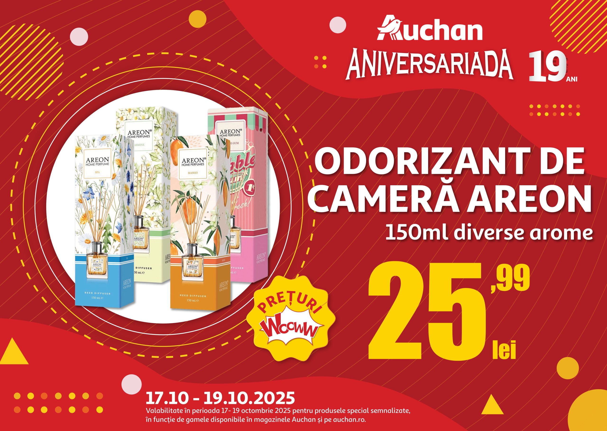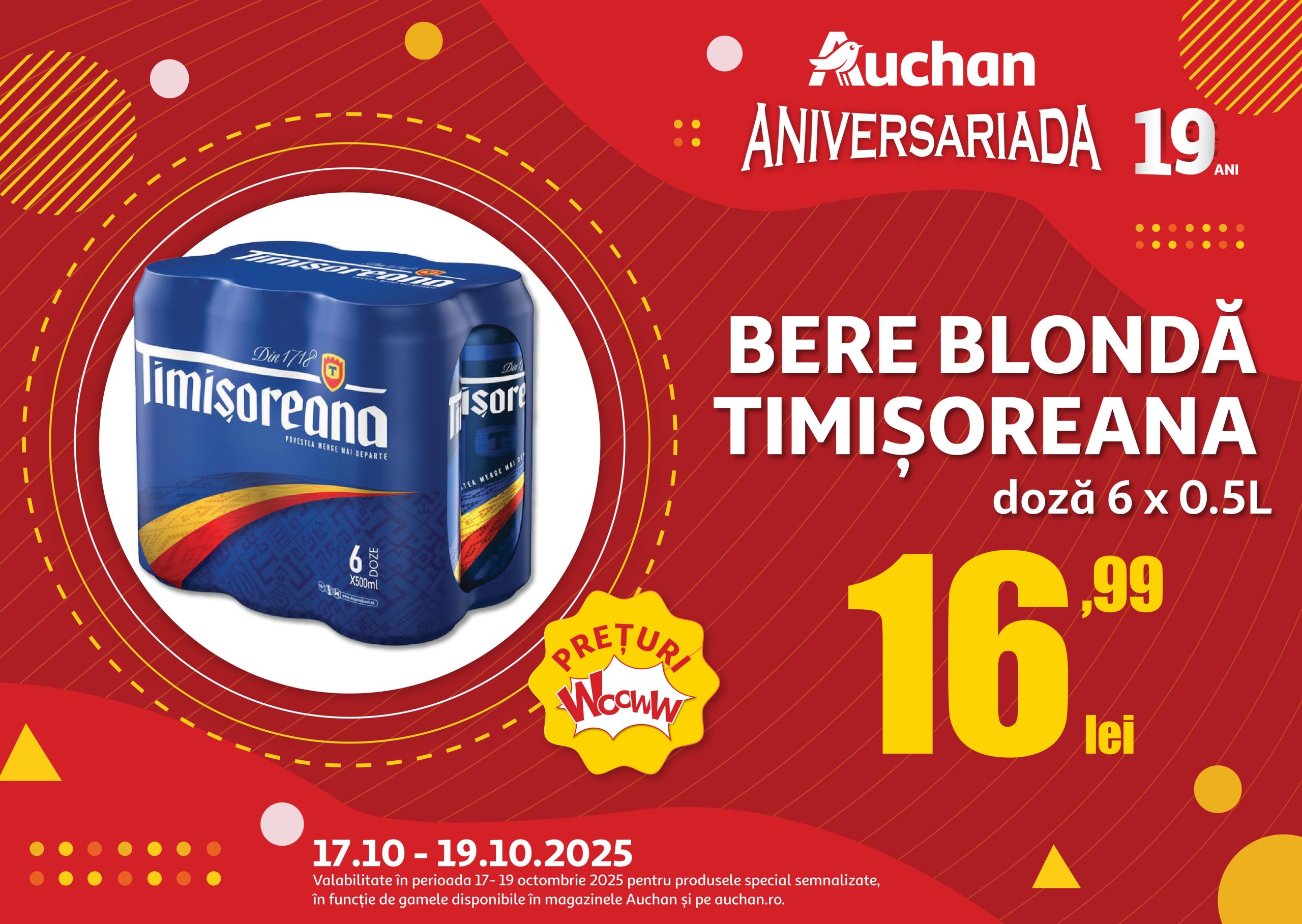 Auchan transformă fiecare zi într-o competiție a ofertelor și reducerilor. Până pe 21 octombrie, magazinele Auchan din toată țara sărbătoresc 19 ani de prețuri mici zi de zi, cu  peste 1.300 de oferte la produsele care contează în bugetul familiei și reduceri de până la peste 50% la o selecție variată de articole.