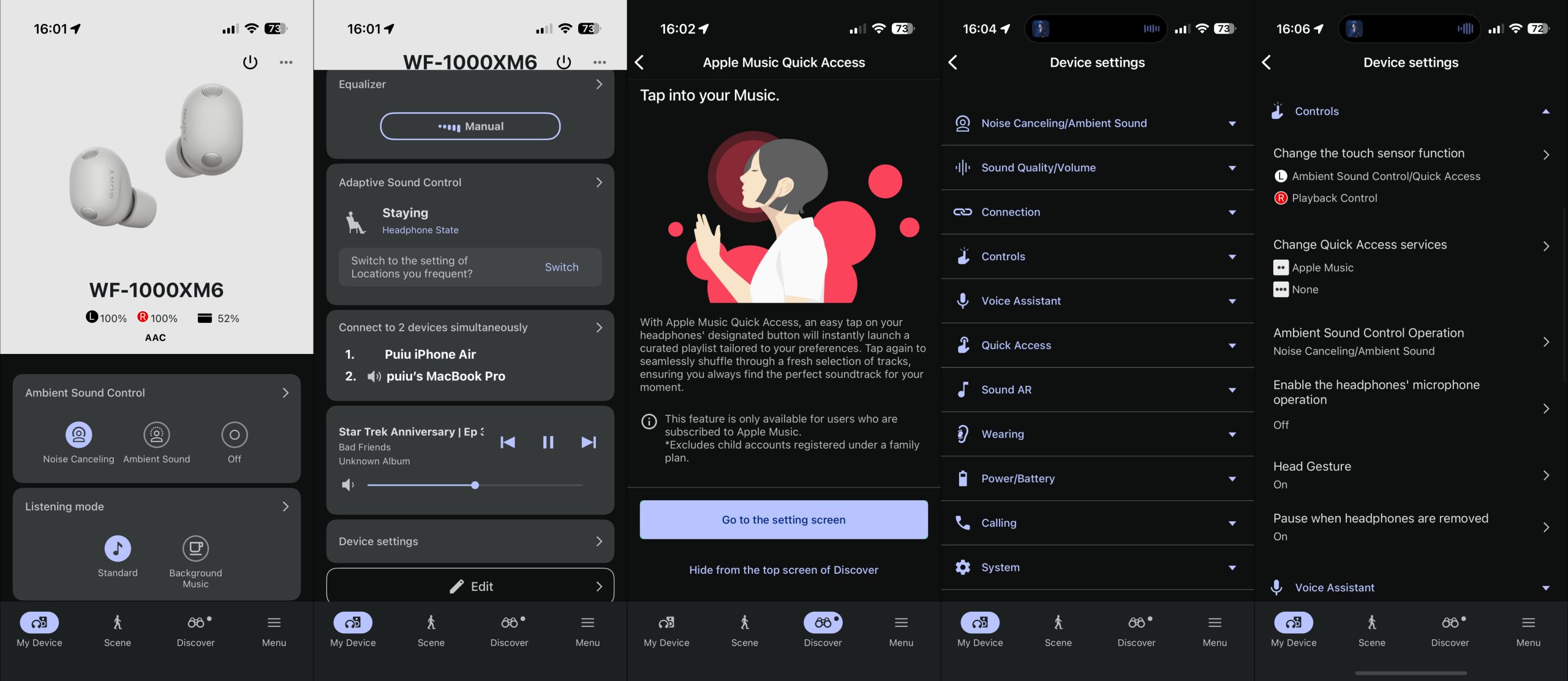 După cum mă așteptam, mai ales pentru că am testat majoritatea versiunilor anterioare de WF-1000XM, aceste căști sunt, din multe puncte de vedere, impecabile. Indiferent dacă vorbim de calitatea apelurilor audio, de izolarea activă față de zgomotele de fundal sau de anduranță, este ușor să te entuziasmezi la modul în care funcționează și la experiența pe care ți-o pun la dispoziție. Împerecherea este facilă chiar și în tandem cu al meu iPhone Air, iar adăugarea celui de-a doilea dispozitiv multipoint durează câteva momente după ce ai bifat opțiunea necesară în aplicația Sound Connect. Tranziția între cele două dispozitive este mai rapidă ca niciodată, dacă ascult un podcast pe Mac și îmi sună telefonul, pot răspunde imediat. Interlocutorii mi-au semnalat că mă aud mai bine pe WF-1000XM6 decât pe ale mele AirPods Pro 3, alte căști in-ear deloc ieftine.