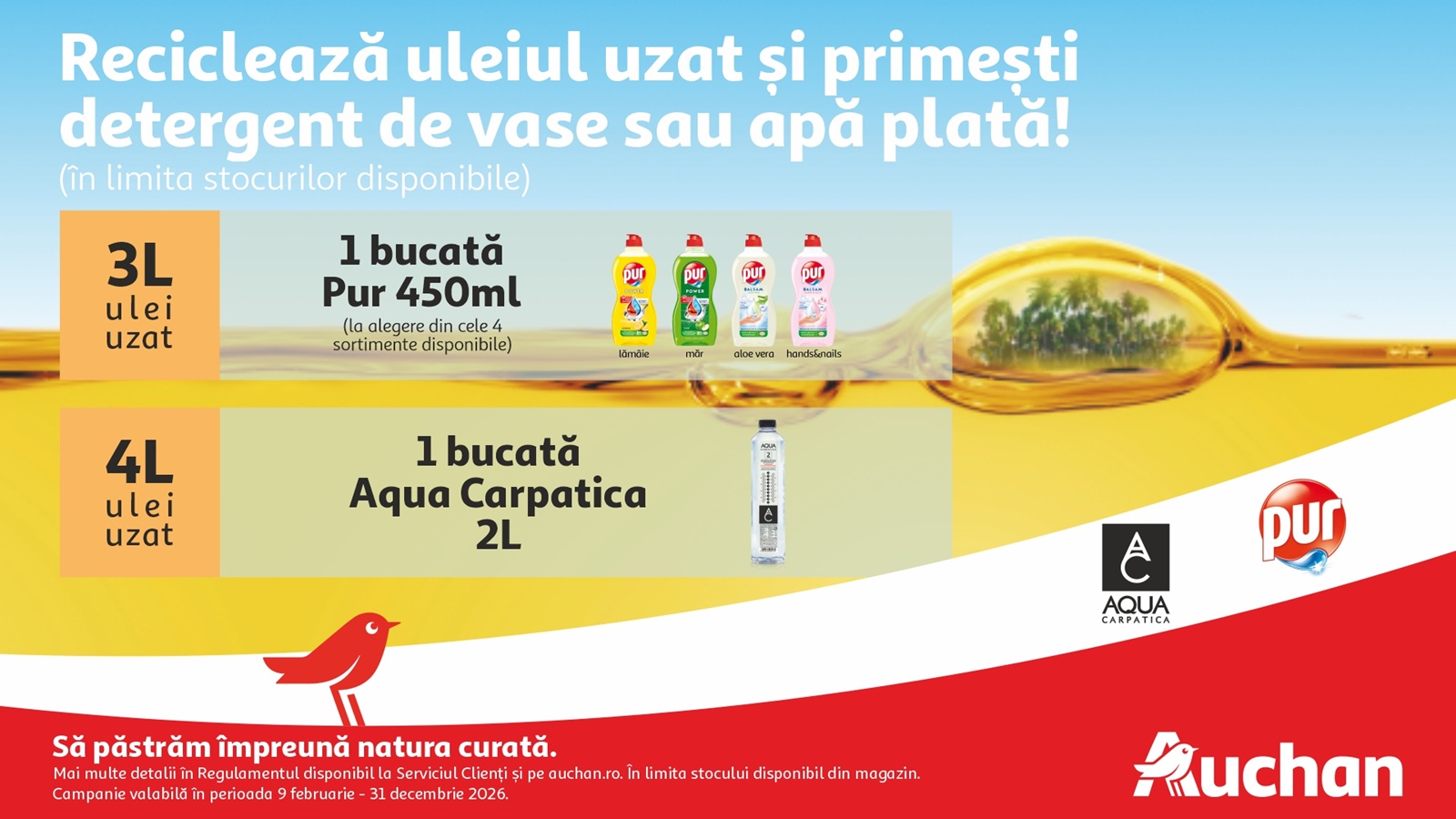 Pentru a încuraja reciclarea uleiului de gătit și un comportament de consum mai responsabil, Auchan România, alături de partenerii săi, recompensează gestul clienților care predau uleiul alimentar uzat în hipermarketurile și supermarketurile Auchan și ATAC, în funcție de cantitatea colectată. Inițiativa este susținută prin parteneriate cu Henkel și Valvis, astfel că, de la minimum 3 litri de ulei predat, clienții pot primi la schimb un detergent de vase Pur 450 ml sau o sticlă de apă plată Aqua Carpatica de 2 litri. Uleiul alimentar uzat colectat este predat spre reciclare și transformat ulterior în biocombustibil.
