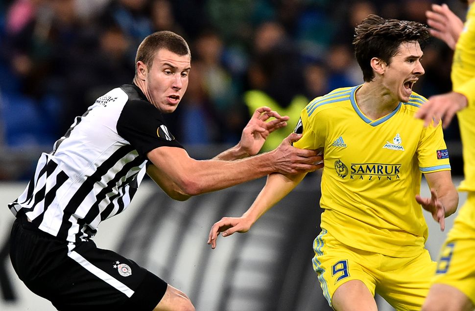6030721 03.10.2019 Partizan's Starhinja Pavlovic and Astana's Dorin Rotariu react during the Europa League Group L soccer match between Astana and Partizan, in Nur-Sultan, Kazakhstan.,Image: 475045981, License: Rights-managed, Restrictions: Editors' note: THIS IMAGE IS PROVIDED BY RUSSIAN STATE-OWNED AGENCY SPUTNIK., Model Release: no, Credit line: Vladislav Vodnev / Sputnik / Profimedia