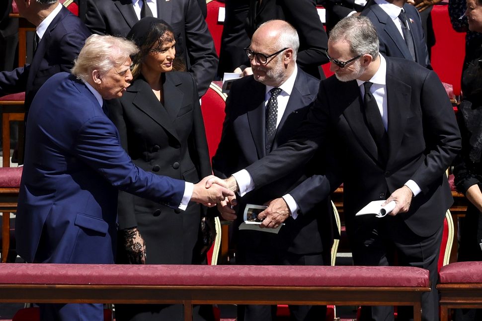 Rome, Lazio, Italy: King Felipe VI of Spain (R) and USA President Donald Trump (L) shake hands during the funeral of Pope Francis, (CL) USA First Lady Melania Trump and (CR) Estonian President Alar Karis.,Image: 992609852, License: Rights-managed, Restrictions: * Italy Rights OUT *, Model Release: no, Credit line: Salvatore Laporta/Kontrolab / Zuma Press / Profimedia