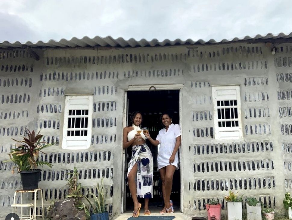 În imagine apar Edna Dantas și fiica ei, Maria Gabrielly, pe prispa casei construite din peste 8.000 de sticle reciclate.