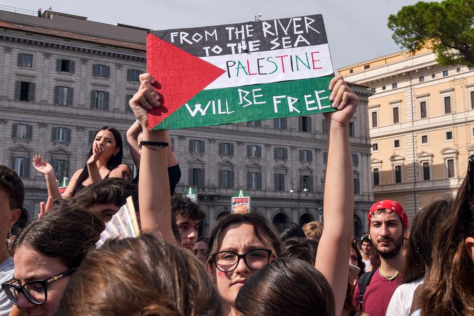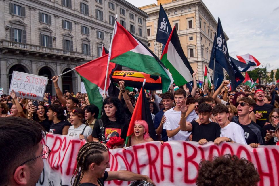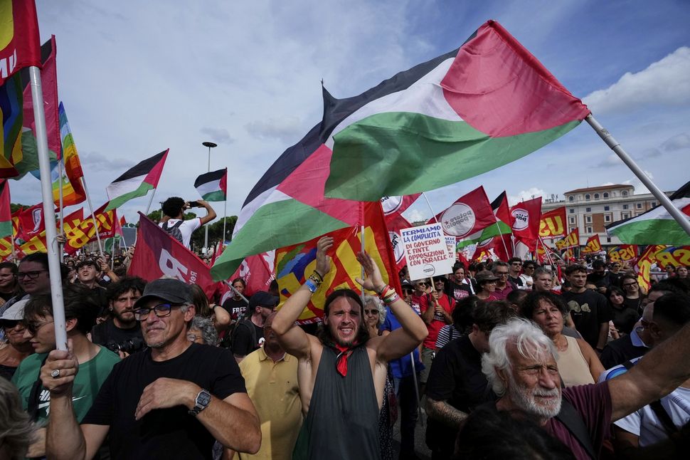 People take part in a demonstration part of a nation-wide protest and general strike against the war in Gaza, in Rome, Monday, Sept. 22, 2025.,Image: 1039348133, License: Rights-managed, Restrictions: This content is intended for editorial use only. For other uses, additional clearances may be required., Model Release: no, Credit line: Alessandra Tarantino / AP / Profimedia