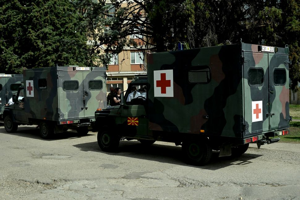 Medical units of the Macedonian army arrive to reinforce the staff at a local hospital in Kocani, a town some 100 kilometres east of the capital Skopje, on March 16, 2025, following a fire in a nightclub which killed 51 people. A fire that tore through a nightclub in North Macedonia killed 51 revellers attending a hip-hop concert at the venue, with more than 100 wounded, the country's interior minister said on March 16, 2025. Local media speculated that the fire was probably caused by the use of pyrotechnic devices.,Image: 976295901, License: Rights-managed, Restrictions: , Model Release: no, Credit line: Robert ATANASOVSKI / AFP / Profimedia