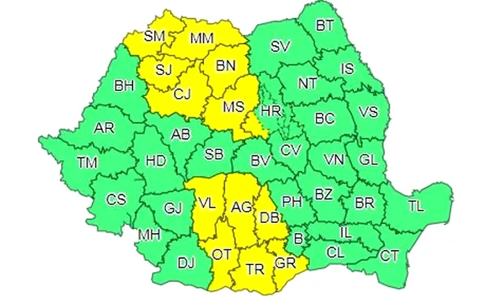 ANM a emis un cod galben de vreme rea pentru a doua parte a zilei de miercuri. Acesta întră în vigoare la ora 14:00 și expiră la ora 22:00. În acest interval se vor semnala averse torențiale, frecvente descărcări electrice, grindină și vijelii.