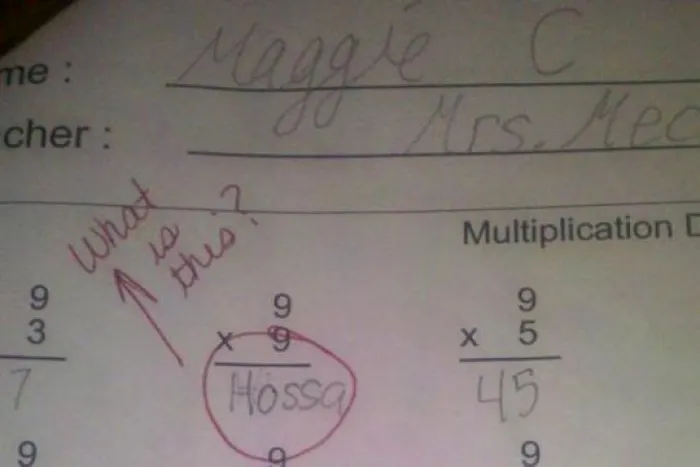 Exercițiul la care părea că a greșit era unul extrem de simplu, la care restul colegilor fetiței au răspuns exact cum trebuie. Aceasta a avut de răspuns la întrebarea „cât fac 9×9”, iar ea a scris pe lucrarea ei „Hossa” și apoi a predat-o învățătoarei.