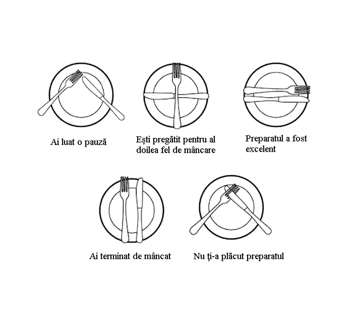 În caz contrar, dacă felul de mâncare nu a fost pe placul vostru, încrucişaţi furculiţa şi cuţitul în farfurie, introducând lama cuţitului printre dinţii furculiţei. În acest fel, bucătarul își va da seama că preparatul culinar nu a ieșit așa cum a dorit.