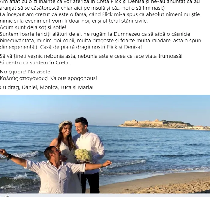 „Suntem foarte fericiți alături de ei, ne rugăm la Dumnezeu ca să aibă o căsnicie binecuvântată, minim doi copii, multă dragoste și foarte multă răbdare, asta o spun din experiență:) Casă de piatră dragii noștri Flick și Denisa!”, a mai scris Daniel Buzdugan pe rețelele de socializare.