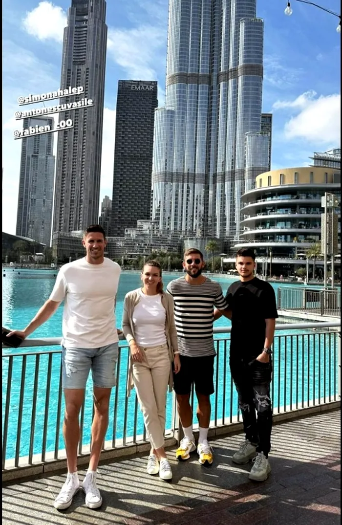 Alături de Simona Halep în fotografiile din Dubai apar: Fabien Cosmao, de la academia lui Patrick Mouratoglou, Vasile Antonescu, sparring partner și Mihai Pal, fizioterapeut.