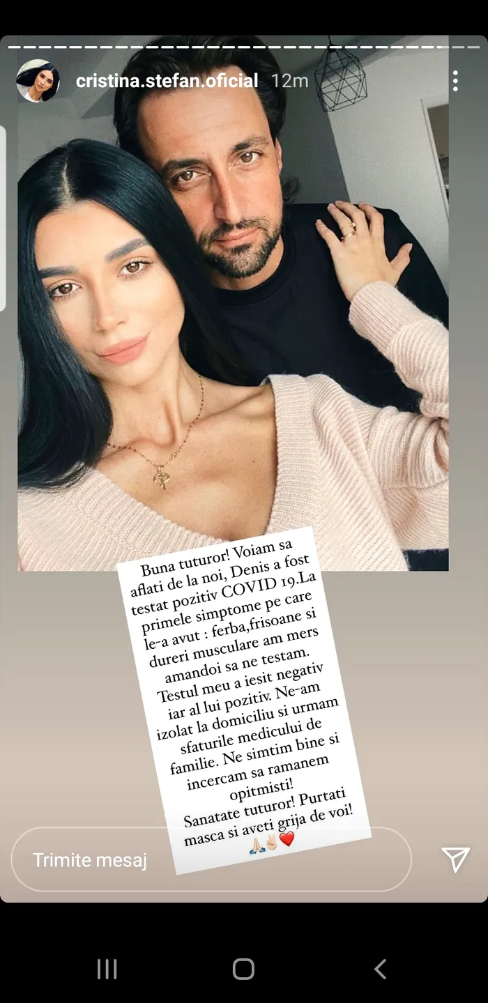 ”Bună, tuturor! Voiam să aflați de la noi, Denis a fost testat pozitiv cu covid-19. La primele simptome pe care le-a avut: febră, frisoane, dureri musculare, am mers amândoi să ne testăm. Testul meu a ieșit negativ, iar al lui pozitiv. Ne-am izolat la domiciliu și urmăm sfaturile medicului de familie. Ne simțim bine și încercăm să rămânem optimiști. Sănătate tuturor. Purtați mască și aveți grijă de voi”, este mesajul Cristinei Ștefan.