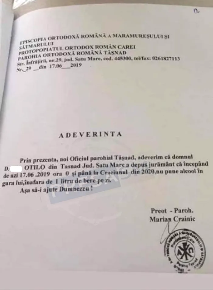 „Prin prezenta, noi, Oficiul Parohial Tășnad, adeverim că domnul D. Otilo, din Tășnad, județul Satu Mare, a depus jurământ ca începând de azi, 17.06.2019, ora 0.00, și până la Crăciunul din 2020, nu pune alcool în gura lui, în afară de un litru de bere pe zi. Așa să-i ajute Dumnezeu”, se arată în documentul eliberat de biserică.