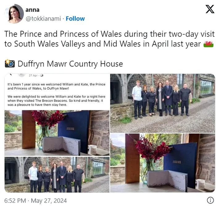 Duffryn Mawr Country House, o pensiune din Parcul Național Brecon Beacons, a distribuit o postare pe social media, din 2023, atunci când Prințul William și Kate Middleton au stat la reședința lor. Personalul locaţiei din Țara Galilor a publicat o imagine neașteptată cu cuplul regal, înainte ca Prințesa de Wales să afle că are cancer.