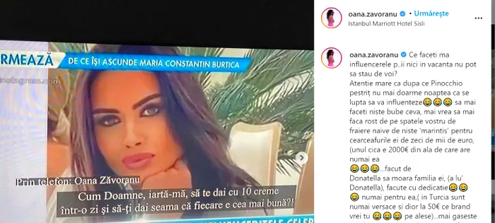 Imaginea de la care a pornit totul este cea pe care v-o prezentăm mai jos: Se pare că este vorba despre un instastory, iar la nume este trecut cel al actriței Oana Zăvoranu. Între timp, ambele poze au fost șterse de pe conturile de socializare, chiar de către Oana Roman, pe un grup de socializare.
