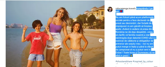 Nu am folosit până acum platformele sociale pentru a face declarații de presă sau dezmințiri…dar forțată de imprejurari m-am gândit să liniștesc apele…Având in vedere că presa din România ne dă deja despărțiți…vreau să clarific că familia noastră a stat neintregita doar datorită COVID-ului cu restricții de călătorie și obligațiilor de antrenor ale soțului meu – noi nu am putut merge in Italia și până la sfârșit de campionat el nu a putut veni in Dubai! Toate bune și Dumnezeu să ne aibă in pază! ?”, a spus Raluca Zenga pe Facebook.