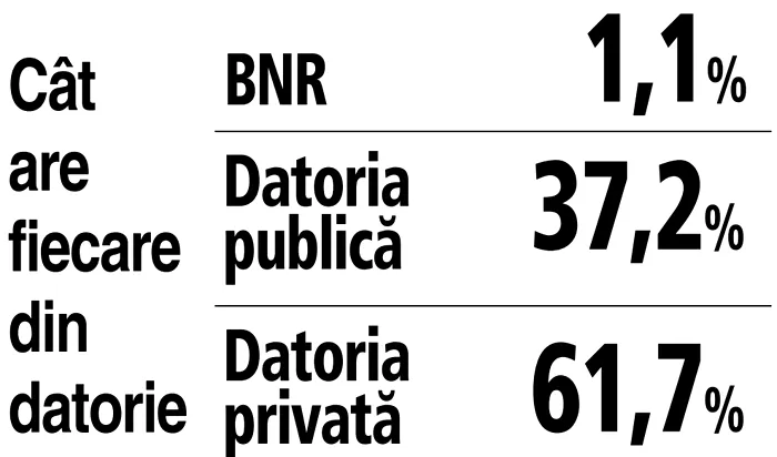 Într-o proporție covârșitoare, datoria externă continuă să fie deținută de sectorul privat. Numai 37,2%, adică 39,5 miliarde euro, din datoria externă este datorie publică. BNR are 1,1% din această datorie, 1,2 miliarde euro, alocări de DTS de la FMI. Segmentul privat deține restul de 61,8 miliarde euro din datoria totală de 106 miliarde euro, iar din datoria mediului privat de 61,8 miliarde euro, 33,2 miliarde euro este o datorie pe termen scurt.
