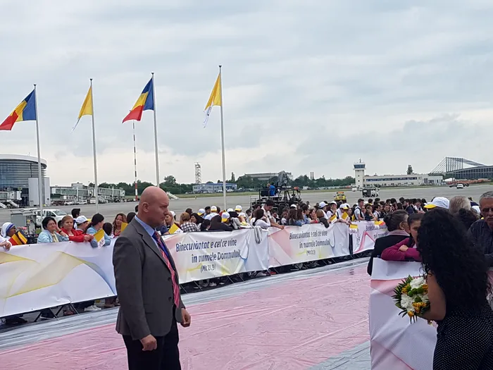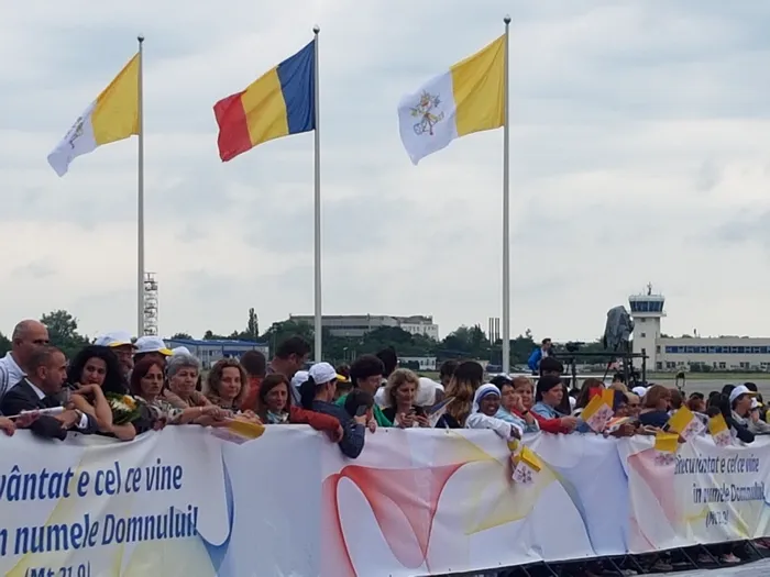 Papa Francisc aterizează pe aeroportul Otopeni în jurul orei 11:30. Sute de oameni s-au adunat, însă, încă de la orele dimineații pentru a-l întâmpina pe Suveranul Pontif.
