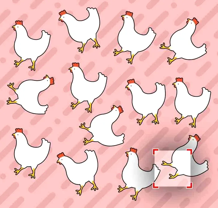 Dar să revenim la imaginea noastră! Una dintre găini este diferită față de celelalte, așa că aveți la dispoziție doar 10 secunde pentru a o descoperi. Pentru a găsi toate indiciile, împărțiți imaginea și priviți fiecare detaliu cu atenție. Este nevoie de atenție mare pentru a găsi găina!