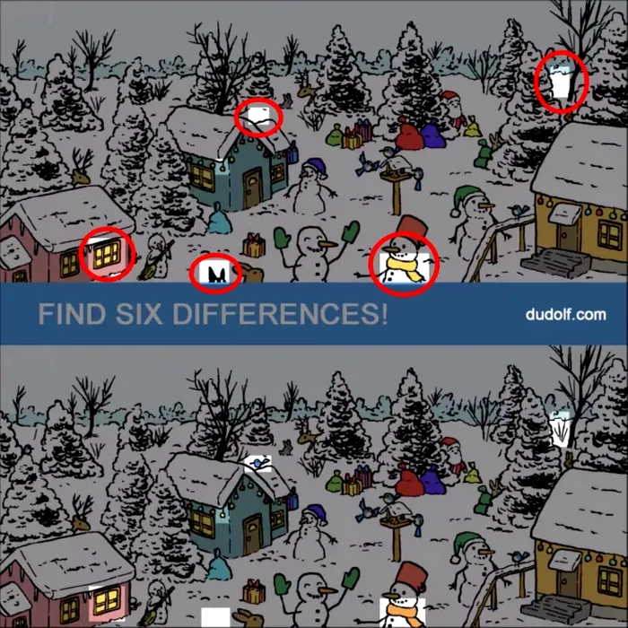 În galeria de mai sus vei vedea două imagini alăturate care, la prima vedere, par identice. Brazi de Crăciun acoperiți de omăt, oameni de zăpadă, căsuțe acoperite cu un strat generos de zăpadă și împodobite de Crăciun, dar și cutii de cadouri. Cu toate că ai fi tentat să spui că nu există nicio diferență între cele două desene, realitatea este cu totul alta. Există 6 diferențe între cele două imagini prezentate mai sus!