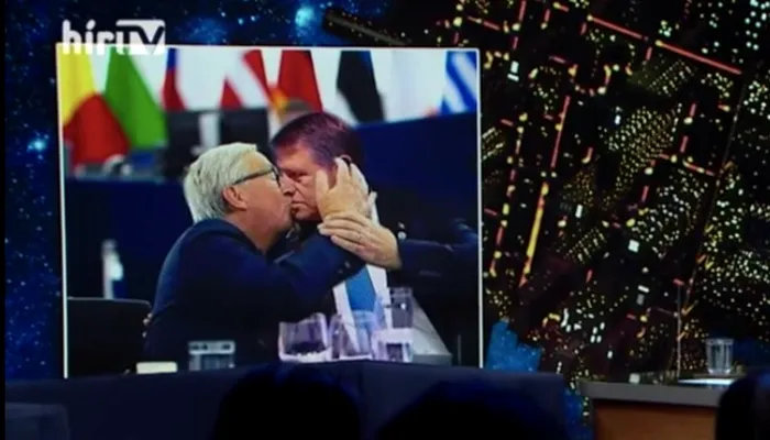 Fotografia cu președintele Klaus Iohannis, care se sărută pe gură cu președintele Comisiei Europene, Jean Claude Juncker, a fost difuzată de o televiziunie apropiată partidului Fidesz, condus de premierul Viktor Orban. Poza este, de fapt, un fake news, după cum remarcă mulți specialiști. Potrivit acestora, trucajul este atât de evident încât nu mai are nevoie de niciun comentariu.