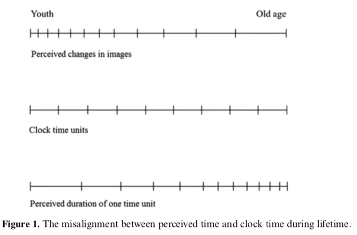 Pe măsură ce îmbătrânești, rata percepției schimbării imaginilor mentale scade datorită mai multor trăsături fizice, incluzând complexitatea creierului, degradarea căilor de transmisie a informațiilor etc. Și acestă schimbare în procesarea imaginilor te face să crezi că timpul trece mai repede.