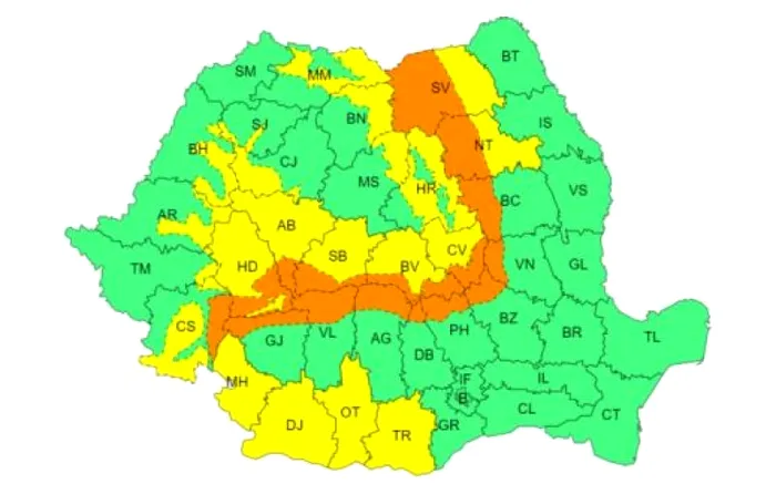 De la ora 03:00 de duminică până luni la ora 10:00, un cod galben de vânt puternic va fi activ în sudul Transilvaniei, vestul și sudul Olteniei, sud-vestul Munteniei și în dealurile subcarpatice ale Moldovei. Vitezele vântului vor varia în general între 55 și 65 km/h, iar în zonele montane și local în Transilvania, rafalele vor depăși 80-90 km/h.